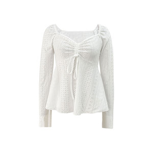 欧美跨境2025年冬季新款优雅女士纯色U领拼接系带花边长袖上衣T恤
