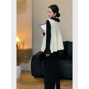 深圳南油秋天一整套穿搭赫本风荷叶边喇叭袖针织长裙马甲显瘦套装