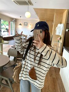 慵懒圆领套头长袖T恤气质打底衫女秋季宽松百搭休闲撞色条纹上衣