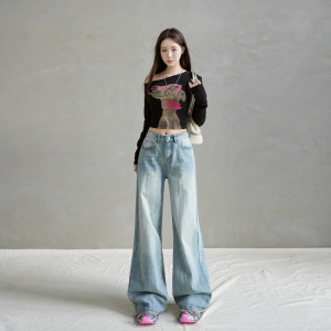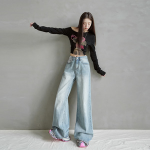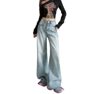 2025秋冬新款&美式复古高腰竹节纹设计阔腿宽松显瘦牛仔裤女