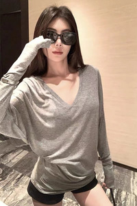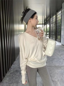 v领蝙蝠袖T恤弯刀百搭扭扭堆叠长袖tee2025新款显瘦低领上衣女