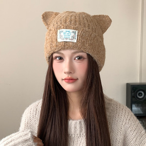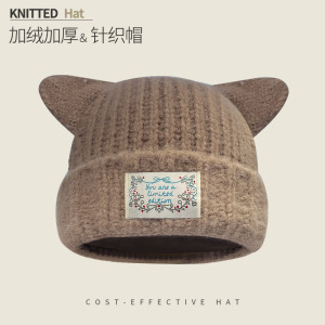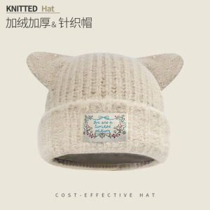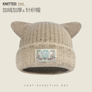 日系可爱猫耳朵毛线帽子女冬季加厚防风套头帽日系保暖护耳针织帽
