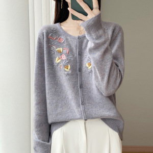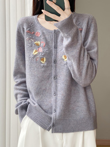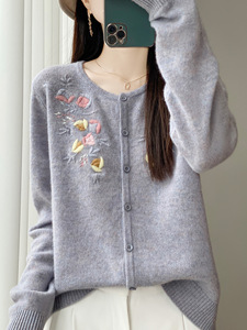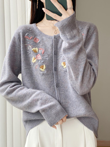 高级感重工刺绣花朵羊毛外套女秋冬季宽松小众圆领单排扣针织开衫
