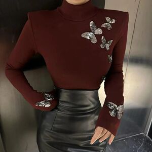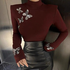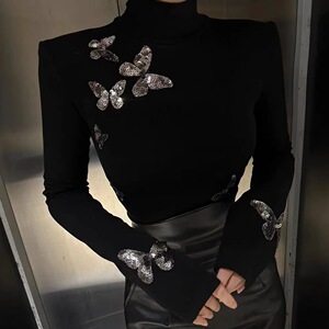 法式新款时尚修身显瘦轻奢风蝴蝶活力感黑色显气质高领小衫