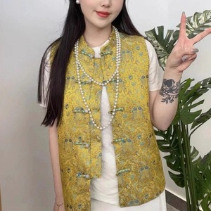 新中式宋锦提花马夹女2025秋季高端民族风珍珠盘扣立领无袖马甲女