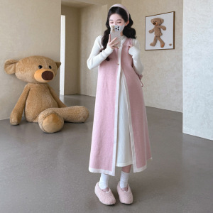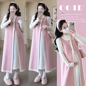 孕妇秋装新款宽松时尚开衫背心裙打底针织裙时尚潮妈甜美两件套女
