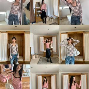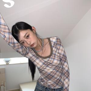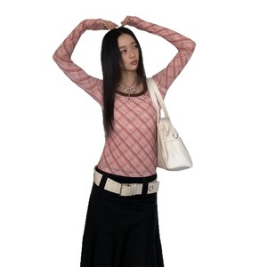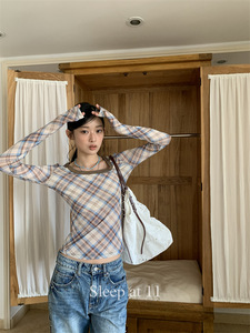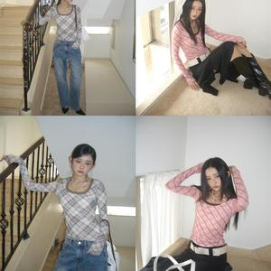 Sleep at 11韩系穿搭格纹修身粉色上衣长袖T恤女内搭打底衫设计感