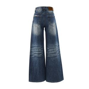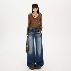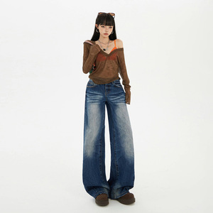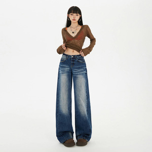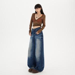 【今茵】美式复古宽松阔腿裤垂感百搭水洗褶皱感渐变牛仔裤女新款