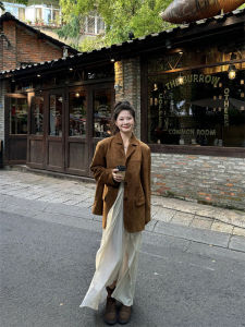 麂皮西装外套女2025春秋季新款美拉德棕色感小个子咖色上衣