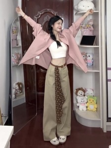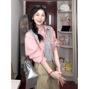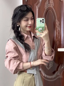原版面料韩系粉色polo翻领长袖衬衫女秋季高级感chic内搭开衫衬衣