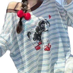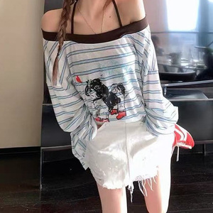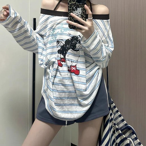 蓝色条纹挂脖一字肩防晒罩衫轻薄上衣宽松慵懒风秋季修身长袖上衣