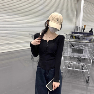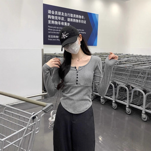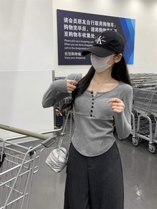 不规则弧形下摆修身打底衫女装秋冬季韩版纯色短款V领长袖T恤上衣