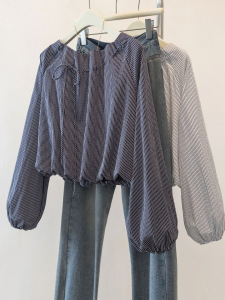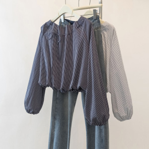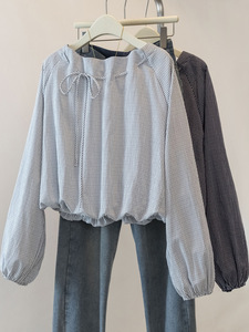 大码胖mm秋装巨好看条纹长袖衬衫女2025新款爆款高级系带显瘦上衣
