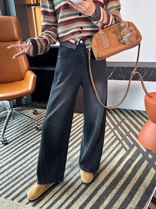 比例王牌!~长短双版复古做旧弯刀牛仔裤女秋季新款直筒阔腿裤子