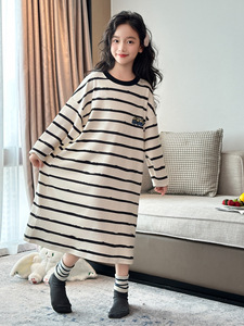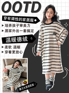 女童睡裙秋冬2025新款儿童冬季德绒家居裙中厚学生条纹中大童睡裙