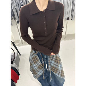 舒适体感~H~简约休闲气质翻领针织衫弹力修身半开领打底衫~秋