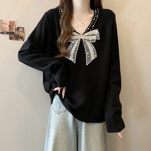 设计感钉珠蝴蝶结长袖针织衫女秋季2025新款大码胖mm遮肉毛衣上衣