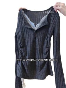 长袖针织V领打底衫女假两件蕾丝设计感纯欲修身内搭上衣开秋穿搭