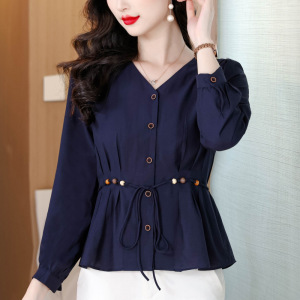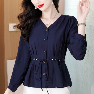 V领长袖衬衫女2025秋季新款时尚收腰系带显瘦洋气减龄开衫上衣潮