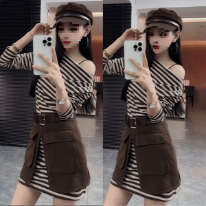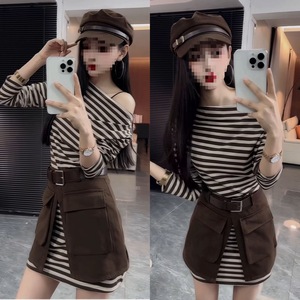 2025秋季新款韩版肩条纹长袖T恤女时尚高腰工装半身裙两件套