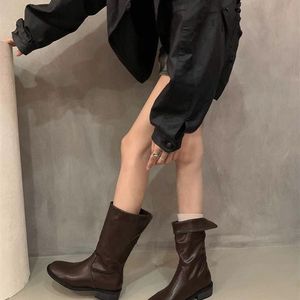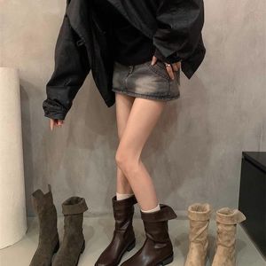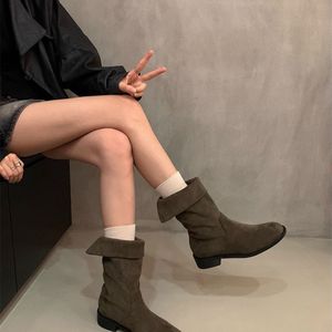 2025秋季新款堆堆靴粗跟短筒女靴子绒面卡其色短靴西部靴骑士靴女