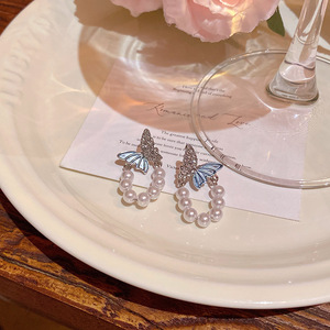 韩系甜美气质超闪镶钻蝴蝶耳环女小众设计感U形珍珠耳钉温柔耳饰