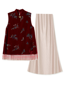 秋季新中式国风套装女红色刺绣流苏高端马甲时尚气质半身裙 N9024