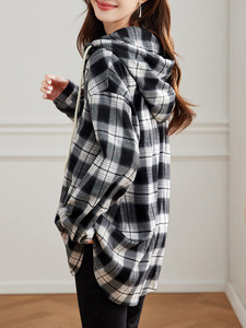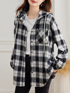 棉茧 连帽格子长袖衬衫女秋装新款韩系大码中长款连帽衬衣外套