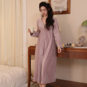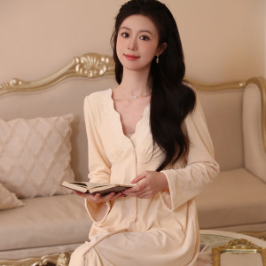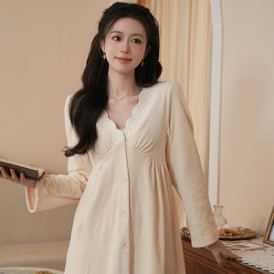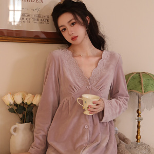 法式小香风女士睡衣秋冬新款V领开衫气质名媛花边长袖薄绒家居服