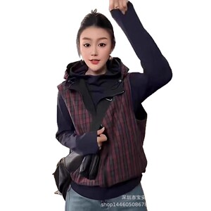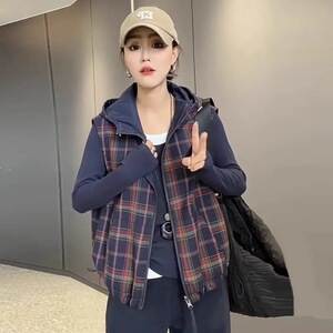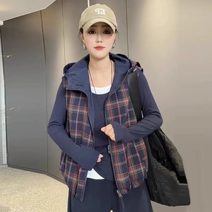 琪镌绘制秋季新款欧货个性格子马甲女连帽宽松两面穿休闲上衣0090