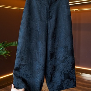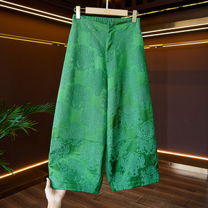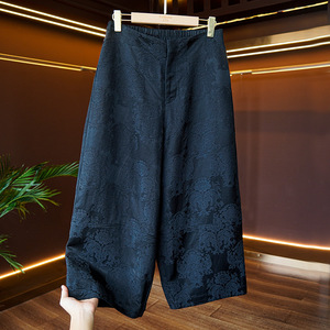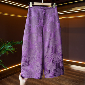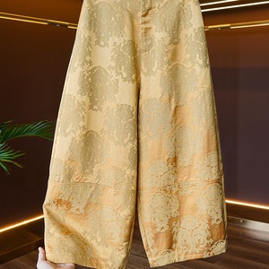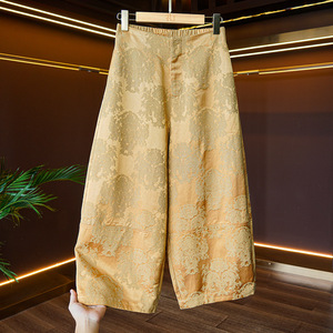 高级感杏色人丝提花新中式休闲裤女秋款国风阔腿裤洋气九分裤子潮