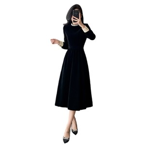 实拍秋季新款法式复古丝绒黑色长裙赫本风连衣裙收腰显瘦御姐长裙
