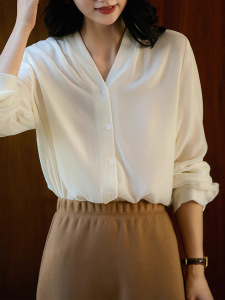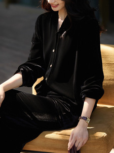 优雅轻奢感 丝绒气质V领单排扣显瘦长袖衬衫上衣女