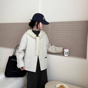 双色拼接连帽2025秋冬新款双面羊绒大衣韩系短款复古羊毛呢外套女