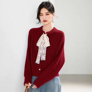 秋款2025本命年设计感蕾丝蝴蝶结领带红色针织衫女法式早秋季毛衣