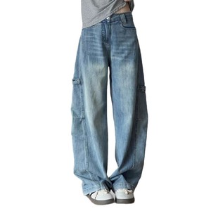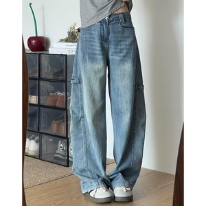 浅蓝色弯刀牛仔裤女2025秋季新款高腰显瘦设计感高街工装阔腿裤子