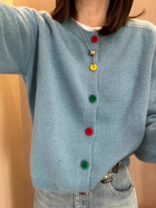 韩系减龄彩虹单排扣圆领宽松针织开衫早秋新款慵懒风小众粉色毛衣