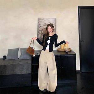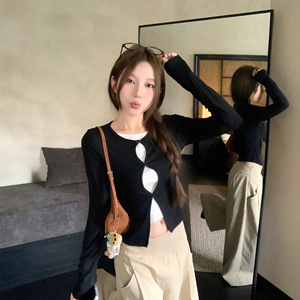 甜辣妹假两件镂空设计感长袖T恤女春秋季新款波点显瘦V领百搭上衣