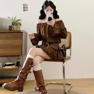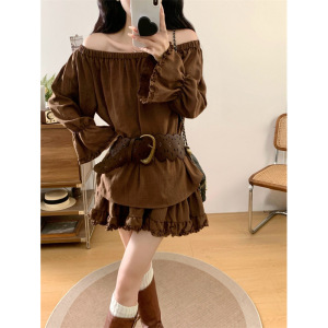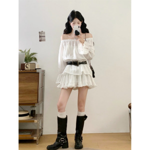 大码胖mm韩系设计感收腰显瘦一字肩长袖衬衫女蓬蓬半身短裙两件套