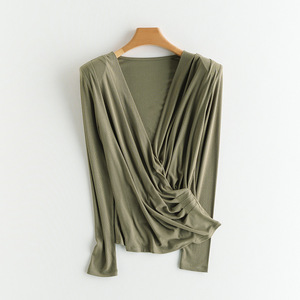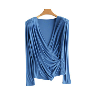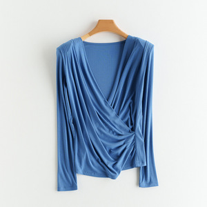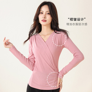 新款女装桑蚕丝长袖T恤薄款修身多巴胺穿搭肌底衣交叉领打底衫女