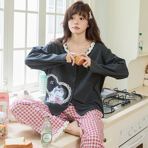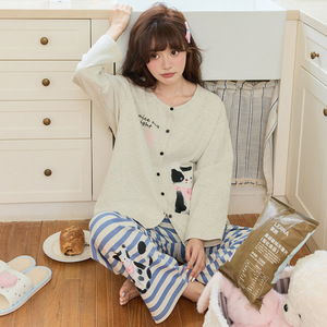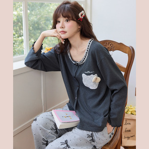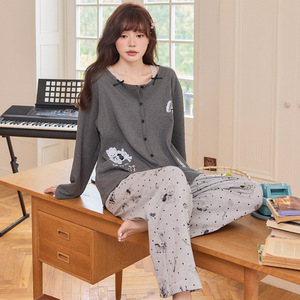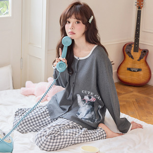 睡衣女秋季长袖长裤紧赛棉女士开衫卡通小狗家居服可外穿外贸批发