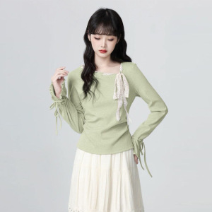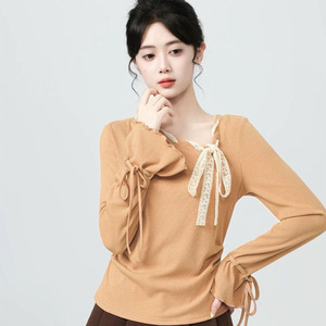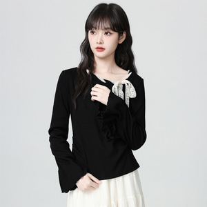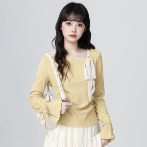 2025秋款法式斜领长袖恤女新法式柔性权力风复古蝴蝶结喇叭袖上衣
