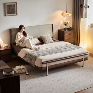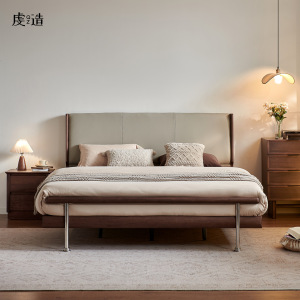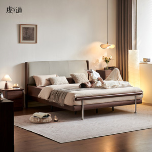 北美黑胡桃木床实木主卧全青皮真皮法式复古中古风1米8软包大床