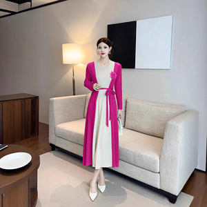 优雅撞色拼接褶皱连衣裙女 收腰系带显瘦气质中长裙