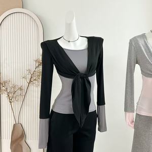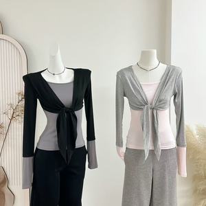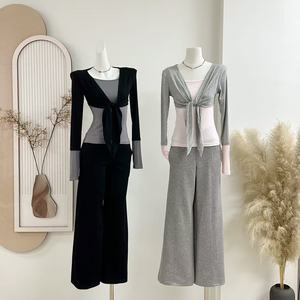 时髦套组假两件长袖上衣/空气层宽腰针织裤两件套2025秋季新款