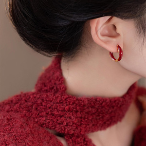 复古安可拉红色滴釉耳环女几何气质高级感耳扣时尚耳圈百搭耳饰品