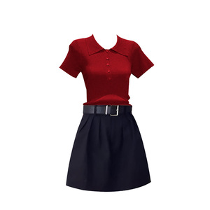 网红洋气炸街POLO领红色针织衫短款上衣高腰半身裙套装
