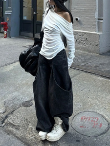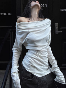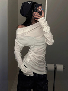 韩好甜WARDEN EDGE 白色一字肩T恤女秋修身褶皱露肩长袖打底上衣
