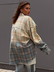 美式街头风渐变色格子外套百搭翻领铆钉装饰磨毛长袖衬衫男女同款