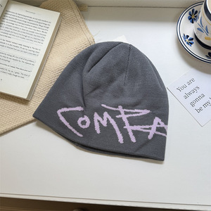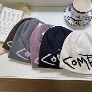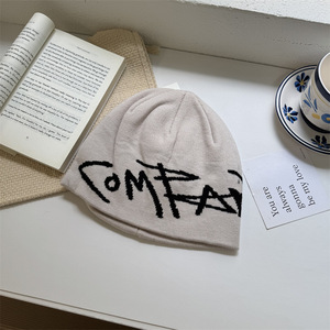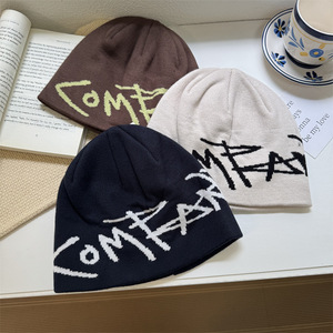 美式字母提花针织帽子女秋保暖护耳套头登山帽男显脸小冬包头冷帽